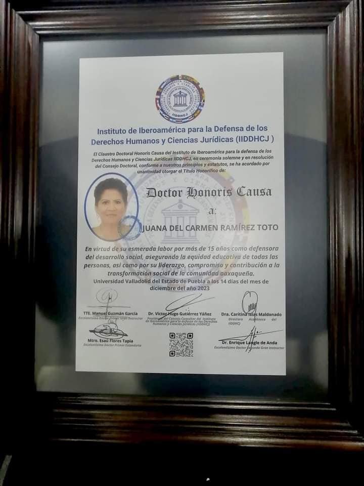 Emitido por el Instituto Iberoamericano para la Defensa de los Derechos Humanos y Ciencias Jurídicas en la ciudad de Puebla, en virtud de su esmerada labor por más de 15 años como defensora del desarrollo social, asegurando el compromiso y contribución social en la comunidad Oaxaqueña.