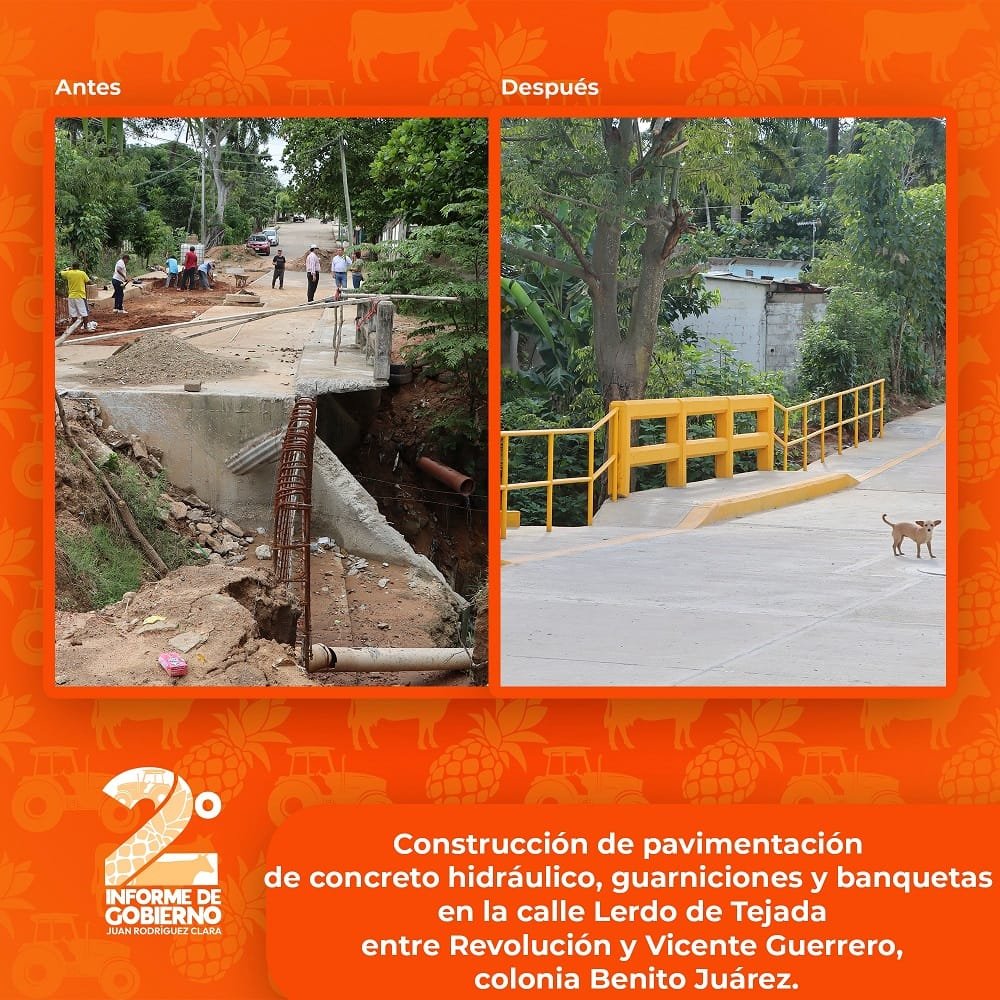 La obra consistió en la construcción de pavimentación de concreto hidráulico, guarniciones y banquetas en la calle Lerdo de Tejada, comprendida entre las calles Revolución y Vicente Guerrero, ubicada en la colonia Benito Juárez. Este proyecto, que abarcó una extensión de 234.90 metros lineales de guarniciones, 234.63 metros cuadrados de banquetas y 961.04 metros cuadrados de pavimento de concreto hidráulico con un espesor de 15 cm, representa un hito significativo para la comunidad.
