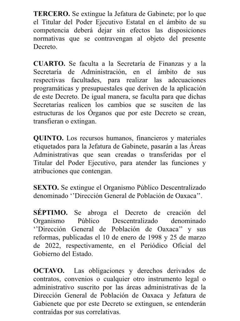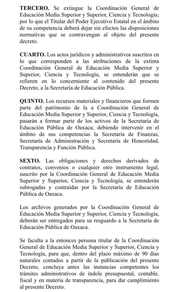 Asimismo, la Dirección General de Población también será suprimida, y la Coordinación General de Educación Media Superior y Superior, Ciencia y Tecnología (CGEMSSCT del Gobierno del Estado de Oaxaca) será integrada a la Secretaría Pública de Oaxaca, bajo la responsabilidad de Delfina Guzmán.